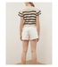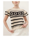 This handmade sweater with ruffle sleeves features open-knit crochet blouse in a striped design with floral details .