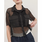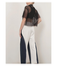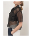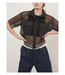 The Ania Top features a mesh, see-through fishnet button-down design with a practical front flap pocket and a relaxed fit. It has a raw-edge hem and is made of 100% polyester.