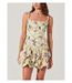 The keyla mini dress features a drop waistline with princess seams, bubble skirt, twisted thin straps, smocked back, and concealed side zipper. Fully Lined.