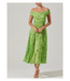 The Leonara Dress is an off-the-shoulder midi dress featuring a pleated skirt and a keyhole cutout.