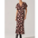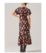 The Talyha dress is a deep chocolate brown, ankle-length piece adorned with a soft floral print in shades of cream, blush, and dusty pink. It features a feminine V-neckline and flutter sleeves that add movement and elegance. The silhouette skims the body and gently flares out with a subtle ruffle hem, giving it a romantic, flowy feel. Paired with black heeled boots, it effortlessly balances modern edge with timeless charm — perfect for transitioning from day to night.