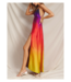 The Donovan Dress features a plunging neckline with cup detail, open back with adjustable cross back straps , and flowing maxi skirt with side slit.