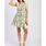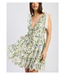 The Charleston Dress is sleeveless with a floral pattern, featuring shades of green, purple, and blue. It features a deep V-neckline with Organza tie straps at the shoulders and a fitted bodice. The waistline is cinched with a drawstring, and the skirt flares out into a short scalloped hem. The overall look is feminine and breezy.