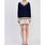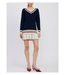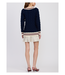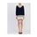 The Knox dress is a stylish combination of a Navy Blue knot top with a V-neckline and a pleated skirt. The neckline and cuffs are accented with a white and maroon stripes, adding a sporty touch. The skirt has subtle striped patterns. The dress blends casual and chic elements seamlessly.