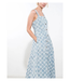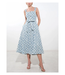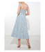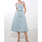 The Flora Dress is a textured denim midi dress featuring straight neckline, straps, self sash, button down detail, full skirt and back zipper closure.