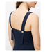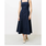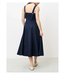 The Alfreda Dress is a sleeveless, midi length with wide adjustable shoulder straps. It features a fitted bodice and a flared skirt. The dress has an overall elegant appearance.