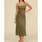 The Fallon Dress is a sleek, midi- length slip dress in Olive Green. It features assymetrical straps, one side has a wide solid strap while the other is a thin strap with decorative beading. A subtle slit on the side allows ease of movement and adds a bit of edge. This dress is ideal for warm-weather events or a casual yet polished day out.