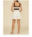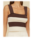 The Lula top is a sleeveless, cropped knit tank featuring wide horizontal stripes in chocolate brown and cream. It has broad shoulder straps and a square neckline, offering a structured, modern silhouette. The ribbed texture adds subtle depth and stretch for a flattering fit. Perfect for pairing with high-waisted shorts or trousers.