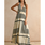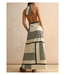 The Monica Dress is a sleeveless maxi dress with a deep V-neckline on a halter top. It features geometric pattern with horizontal and vertical stripes. The dress has a fitted bodice that flares out into a flowing, voluminous skirt.