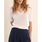 A lightweight knit with a softly textured finish, this relaxed silhouette is framed by a flattering V-neckline and easy short sleeves for an effortless feel. Understated and versatile, it pairs seamlessly with everything from tailored trousers to casual denim—perfect for everyday polish with a hint of ease.