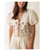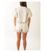 The Miley Top features a v-neckline, puff sleeves, scallop trim and front tie detail.