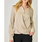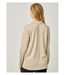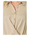 The Monroe Top is a long-sleeve blouse featuring subtle vertical pinstripes. It has a collared neckline with a partial button-down front and a unique draped crossover design at the waist, creating a flattering wrap effect. The blouse pairs well with tailored pants for a chic, professional look.