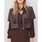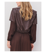 The blouse has a modern leather look and a structured expression with vertical pleats at the front, adding both volume and character. It features short sleeves, a full-length zipper, and a high collar with snap button closure, creating a raw and sleek silhouette. The elastic at the back hem provides a subtly tailored effect.