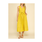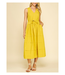 The Pandora Dress features a sleeveless v-neckline, tired skirt, side pockets and self-tie at waist.