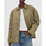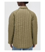 The Sawyer jacket is an olive-green quilted piece with a structured, slightly boxy silhouette. It features a pointed collar, long sleeves, and a front button closure with large, dark buttons that add contrast. The quilting creates a textured, padded effect, giving the jacket both warmth and visual interest. Its length falls just below the hips, offering a casual yet refined look.