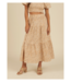 The Trixie Skirt features a midi length tiered skirt with elastic waistband and front slit.