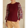 Classic crew neck for a clean and versatile look. Made of a ribbed knit fabric in a rich burgundy color. Slim-fitting silhouette that gently hugs the torso. Statement balloon sleeves in a contrasting floral print fabric. The voluminous, and gathered at the cuffs, adding a romantic and bohemian flair. Color scheme of the floral print complements the burgundy body with shades of blue, ivory, and muted red.