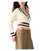 Accented with varsity-inspired striping, ADDISON is a versatile pullover sweater with a faux wrap that you can wear on or off the shoulders.