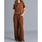 The Alysia pants are high-waisted, wide-leg trousers made of a soft, suede-like fabric in a rich Chicory Coffee color. They feature a drawstring tie at the waist along with belt loops, combining elements of comfort and style. The pants have side pockets and a relaxed, draped fit, creating a casual yet polished look.