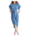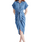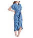 The Tori dress has a rolled collar and cuffed short sleeves, with an adjustable gathered tie-front waist and a high-low hem. The dress is finished with a denim fabric texture, giving it a polished look.
