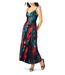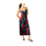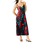 The Violette Dress is a sleeveless, midi-length piece with thin spaghetti straps and a deep V-neckline, featuring a fitted bodice that transitions into a pleated skirt. Its vibrant, abstract floral print blends deep reds, teals, and blacks for a bold, elegant look.