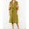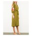 The Tatum Dress is a knee- length Olive Green piece with vertical stripes and a relaxed fit. It features a V-neckline with a subtle Orange and Pink trim, adding a touch of contrast. It also featues three- quarter puffed sleeves and a tied belt at the waist.